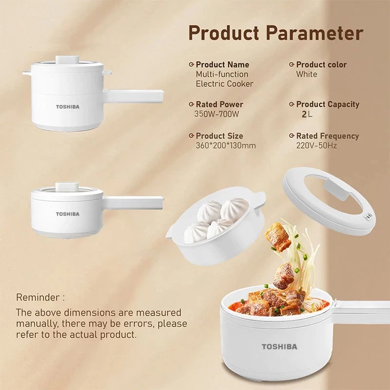 Cook your favorite meals easily with the TOSHIBA 2.0L Multi-Functional Electric Cooker, ideal for hot pot, steaming, stir-fry, and more. With its non-stick coating, included steamer, and dual power adjustment, this compact appliance is perfect for individuals, students, or small families.